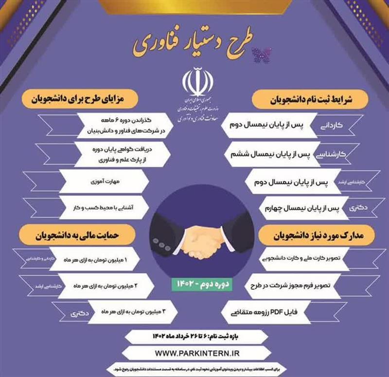 در راستای بهبود توانمندی دانشجویان در حوزه مهارت‌های مرتبط با کسب و کار و توسعه فردی که بهتر است یک دانشجو در طی دوران تحصیل فراگیرد، علاوه بر فراگیری بعضی از این مهارت‌ها ضمن برنامه‌های دستیاری آموزشی و پژوهشی و بسیاری از توانایی‌ها حین انجام پایان‌نامه‌های دانشجویی، لازم است دانشجویان مهارت‌های مرتبط با کارآفرینی، کار تیمی، دانش تجاری و پیشگامی در عرصه فناوری و نوآوری را آموزش ببینند. طرح حاضر تحت عنوان «طرح دستیار فناوری» با راهبری و هدایت دو نهاد دانشگاه و پارک های علم و فناوری در هر استان برنامه‌ریزی شده است. این طرح بر اساس هدایت هدفمند آموزه‌های دانشجویان در راستای استفاده کاربردی و کسب تجربه عملی جهت شکل‌گیری دانشگاه جامعه محور، پاسخگو و کارآفرین و ایجاد انگیزه و حس امید و نشاط و القای تفکر آموزش پویا در دانشجویان و با هدف تربیت نیروی متخصص تنظیم و برنامه‌ریزی شده است. آیین نامه-دستیارفناوری سامانه ثبت نام:http://www.parkintern.ir جهت کسب اطلاعات بیشتر با شماره‌های  35003430 و 35003456 تماس حاصل فرمایید.